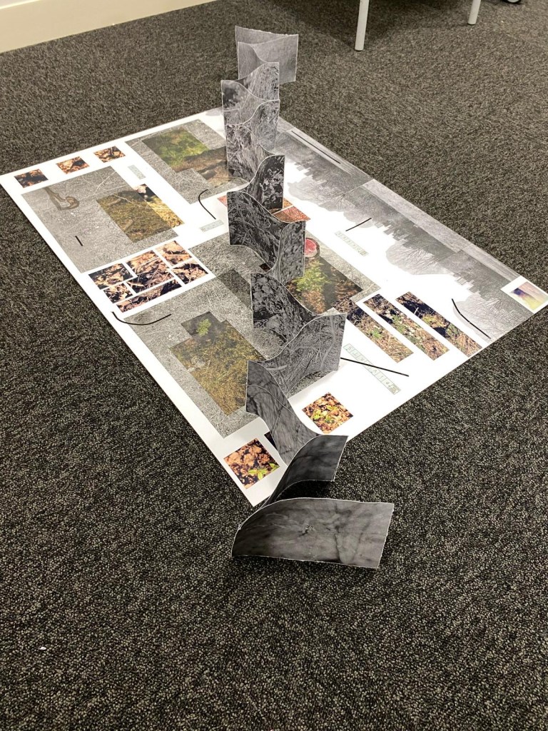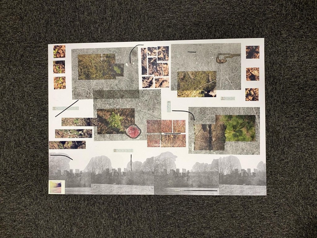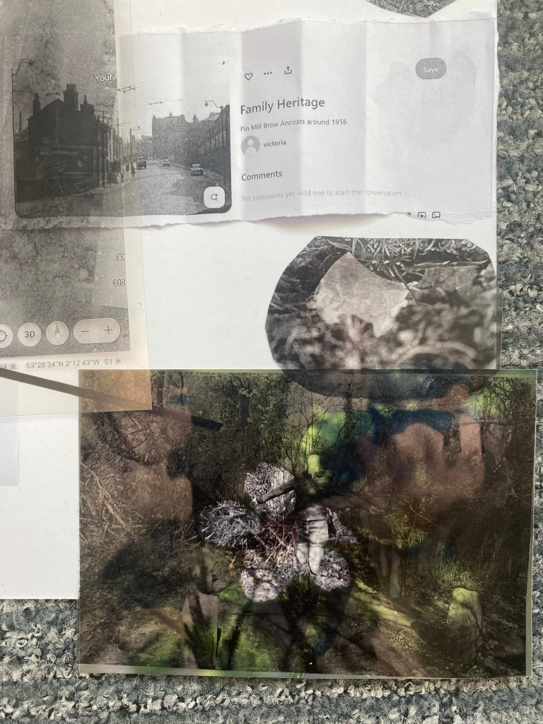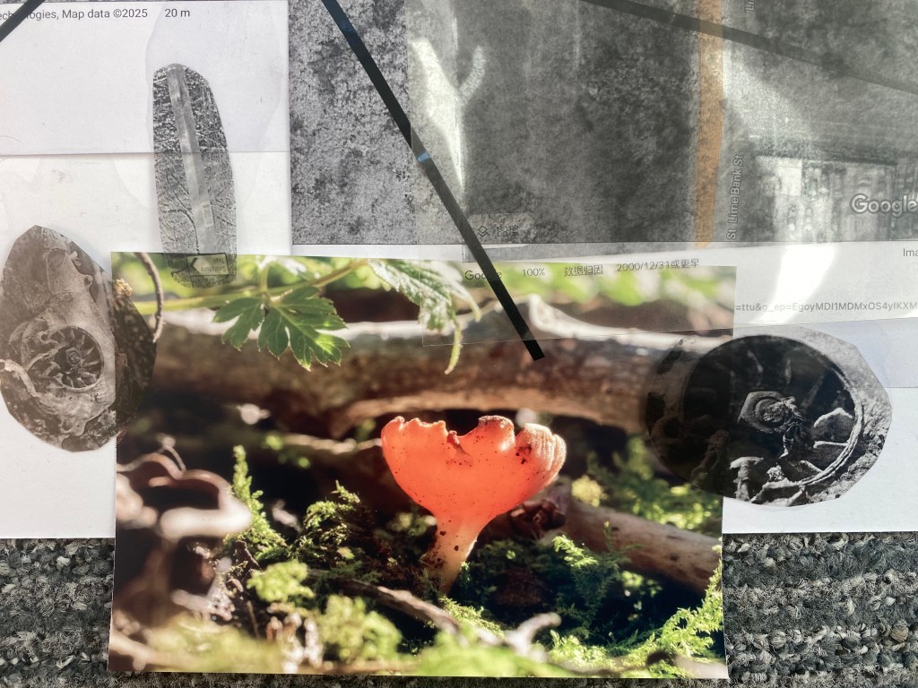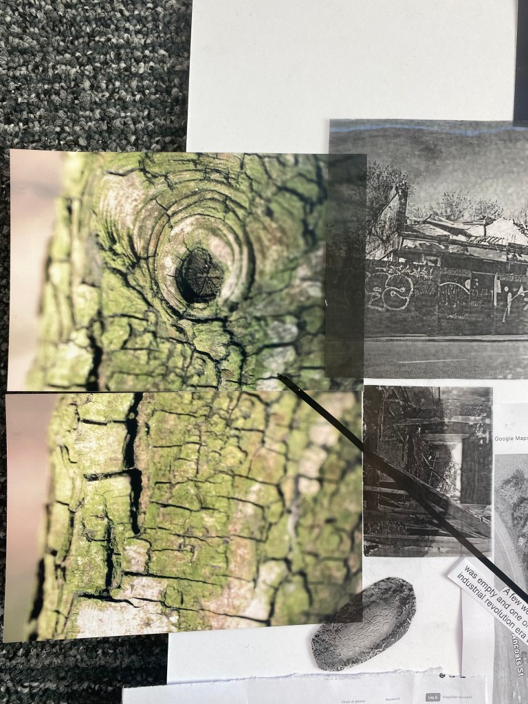 A group of 20 or more students from the MA Visual Anthropology and PhD in Visual Anthropology from the university visited Pin Mill Brow in mid-March to experiment with various kinds of sensory mapping of the space and its histories. Using a variety of different cameras, macro (close-up) lenses, and small endoscopes attached to their mobile phones the students engaged with the textures and historical resonances of the area. They looked at the remains of the cobbled streets and wooden curbs, but also at the flora, from close-ups of fungi to the kinds of abstract patterns made by the dense undergrowth. Having gathered a really wide range of material including photographs (both analogue and digital), sound recordings, and direct rubbings of textures from natural and man-made surfaces, the students then spent a session back at the university looking at historical and contemporary maps of Pin Mill Brow, archival photographs of the area, and in groups they collaboratively produced a series of collaged ‘maps’. These were designed to be potential starting points for further investigations of the relationships between the man-made and natural histories of the area, alongside vital contemporary issues such as conservation, and gentrification.