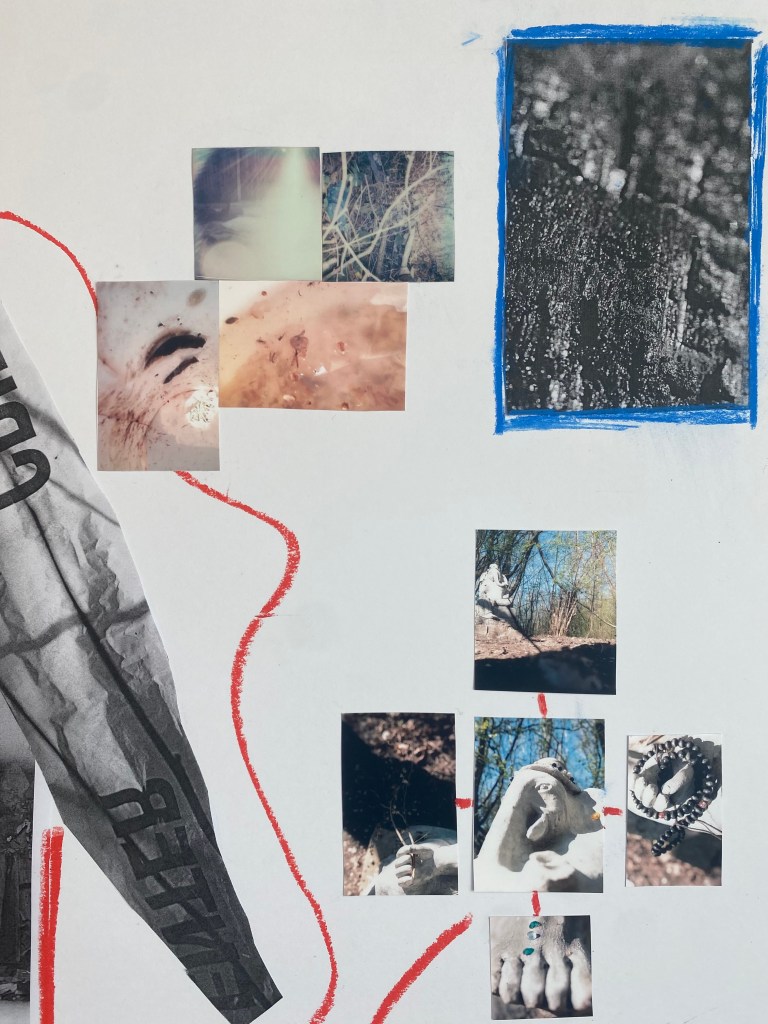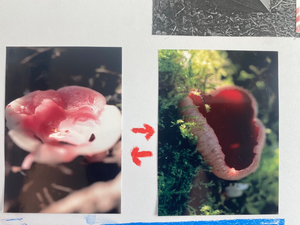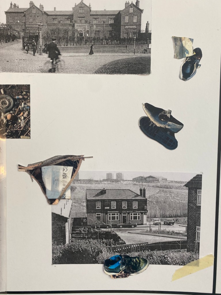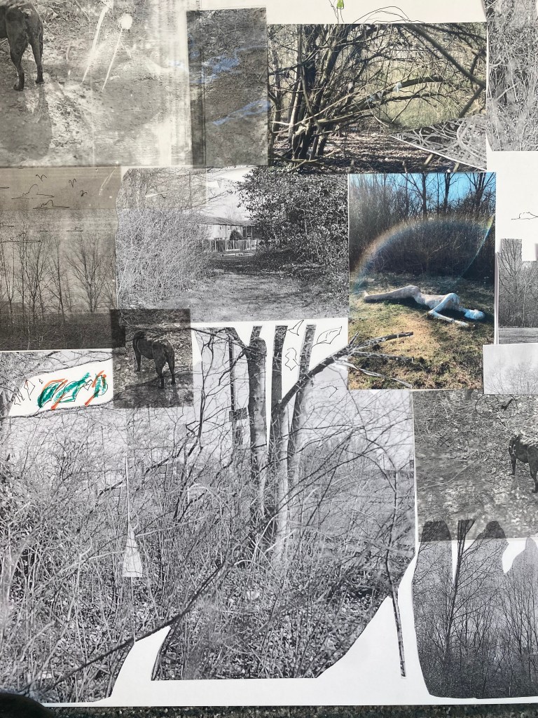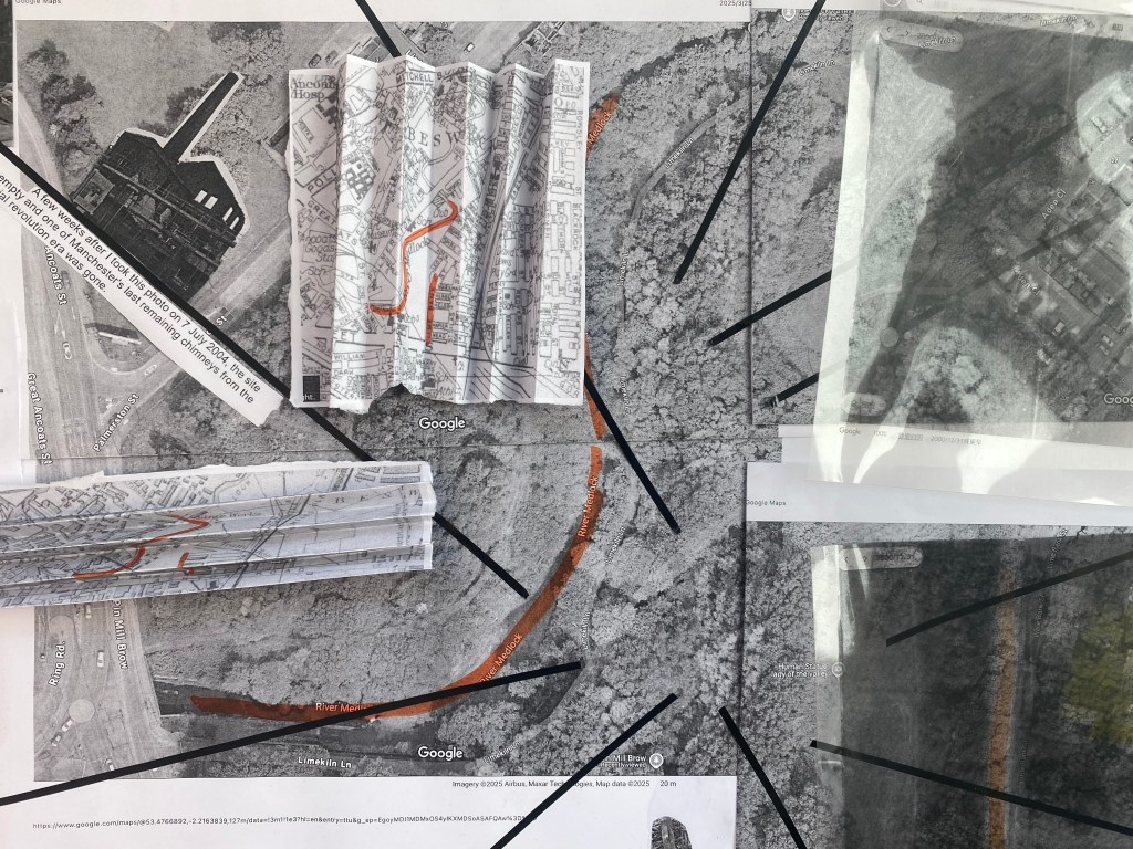 A group of 20 or more students from the MA Visual Anthropology and PhD in Visual Anthropology from the university visited Pin Mill Brow in mid-March to experiment with various kinds of sensory mapping of the space and its histories. Using a variety of different cameras, macro (close-up) lenses, and small endoscopes attached to their mobile phones the students engaged with the textures and historical resonances of the area. They looked at the remains of the cobbled streets and wooden curbs, but also at the flora, from close-ups of fungi to the kinds of abstract patterns made by the dense undergrowth. Having gathered a really wide range of material including photographs (both analogue and digital), sound recordings, and direct rubbings of textures from natural and man-made surfaces, the students then spent a session back at the university looking at historical and contemporary maps of Pin Mill Brow, archival photographs of the area, and in groups they collaboratively produced a series of collaged ‘maps’. These were designed to be potential starting points for further investigations of the relationships between the man-made and natural histories of the area, alongside vital contemporary issues such as conservation, and gentrification.